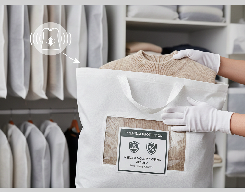 - 加工効果の維持:プロの防虫加工が施されている場合は、過剰な防虫剤は不要です。どうしても心配な場合は、**無臭で揮発性の低いピレスロイド系の防虫シート**を、衣類が触れない収納スペースの隅に置く程度に留めてください。